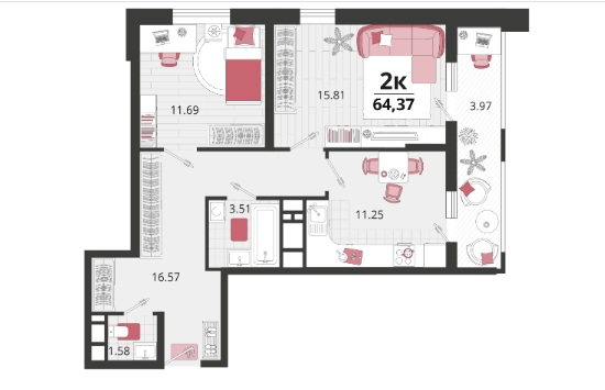 Продается 2-х комн. новостройка, 64.37 кв.м., 16/21 эт