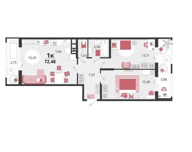 Продается 2-х комн. новостройка, 72.4 кв.м., 3/9 эт