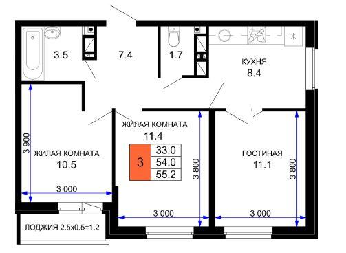 Продается 3-х комн. новостройка, 55.2 кв.м., 11/16 эт