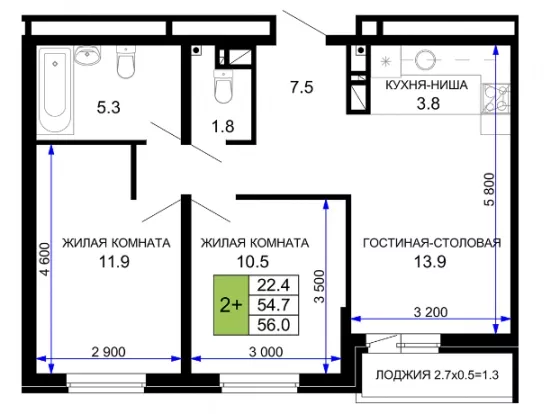 Продается 2-х комн. новостройка, 56 кв.м., 14/16 эт