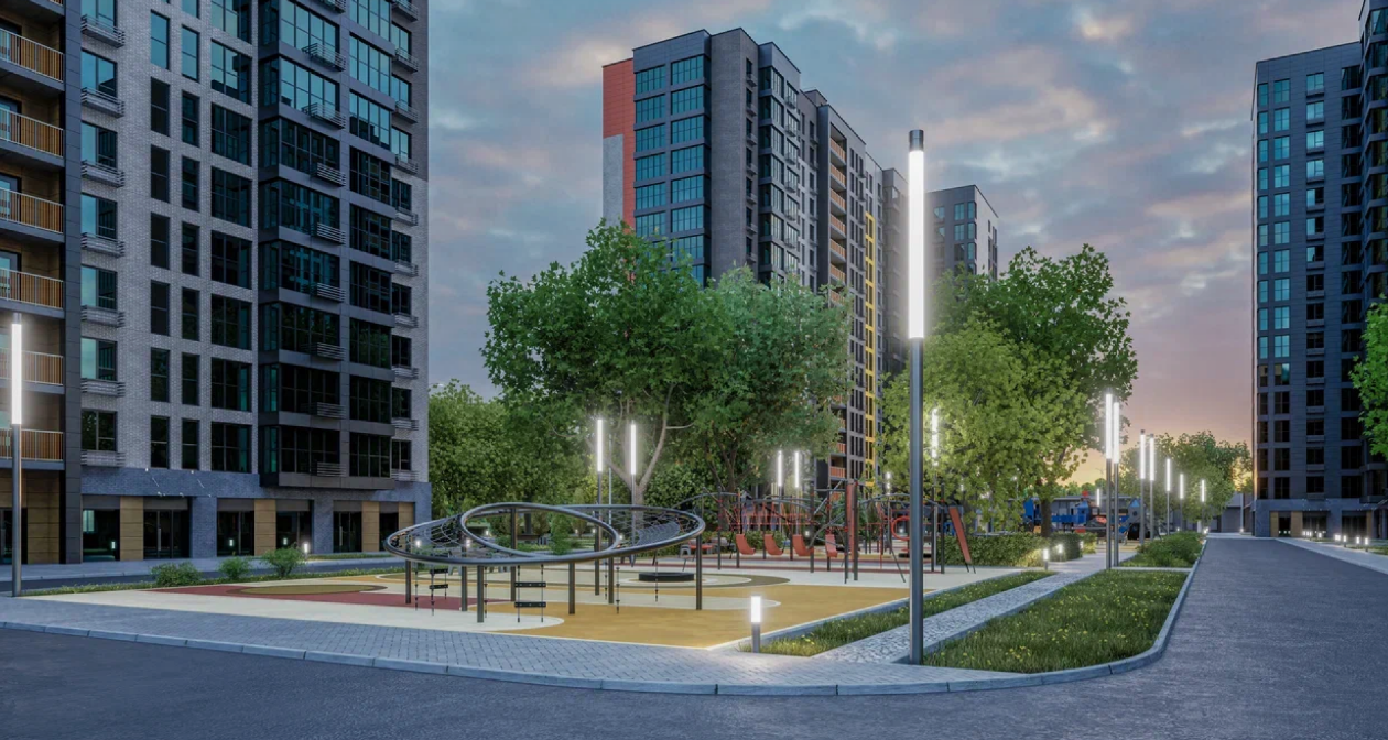 Предусмотрено трехуровневое освещение, спортивные площадки для взрослых и детей, велодорожки, прогулочные зоны: бульвар с фонтаном, аллеи и дворы без машин.