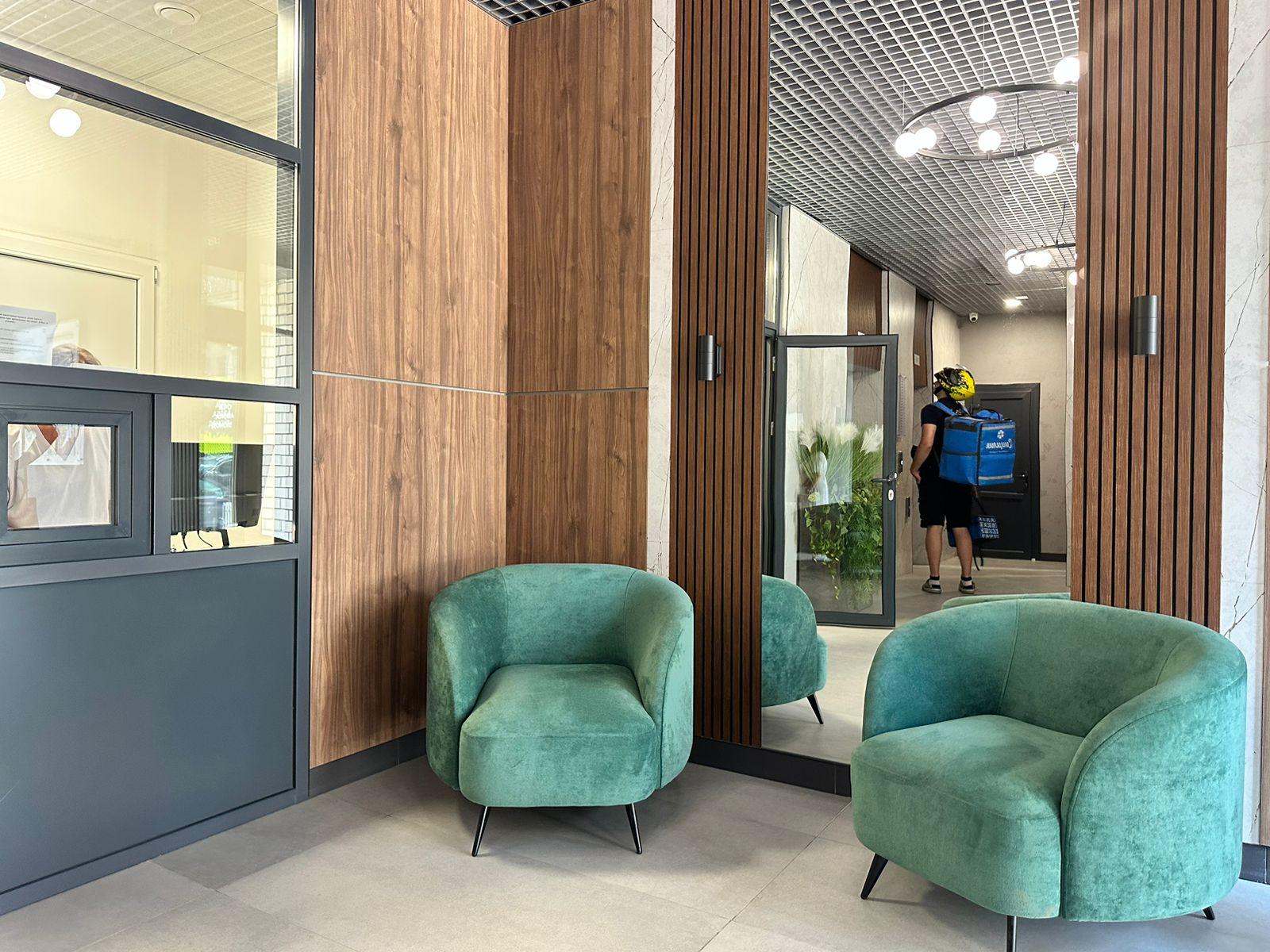 В ДОМАХ: 3 лифта в каждом подъезде, круглосуточное видеонаблюдение, контроль консьержей.