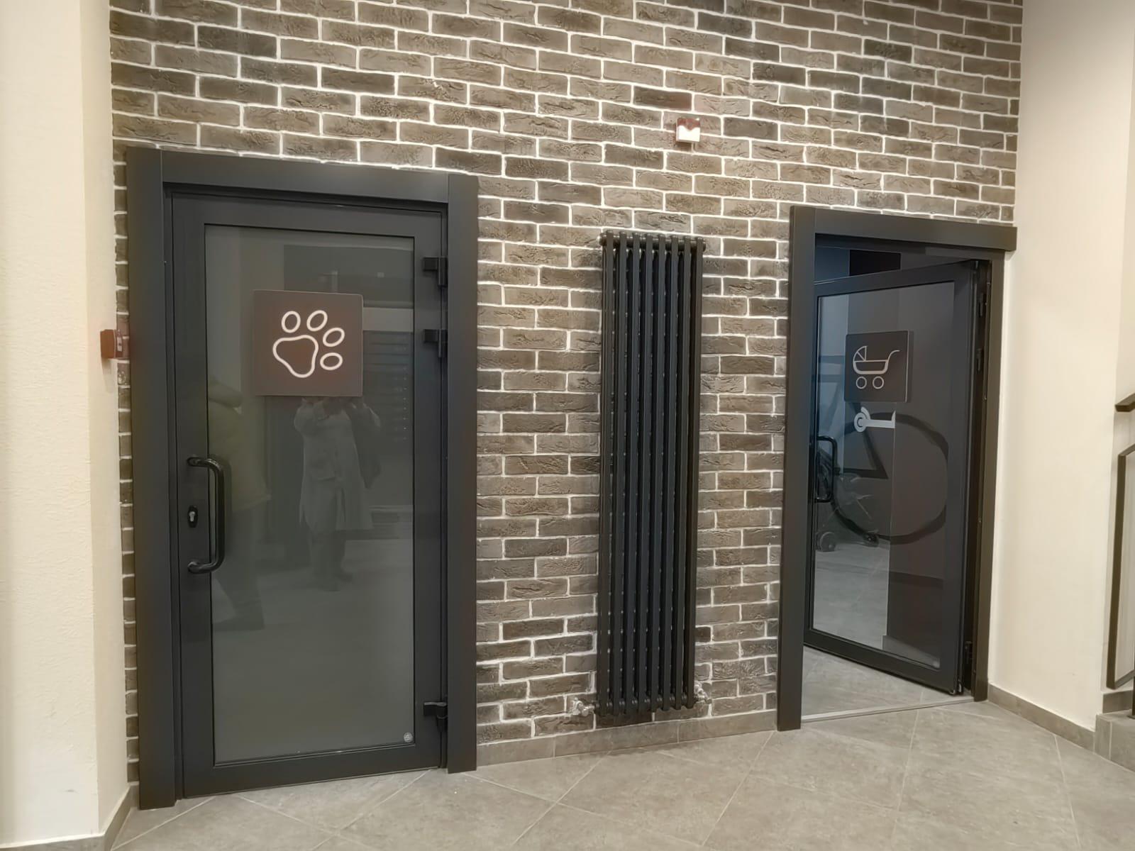 Колясочные и боксы для велотранспорта, лапомойки для питомцев, туалеты.
