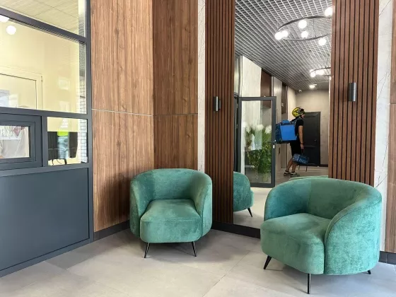 В ДОМАХ: 3 лифта в каждом подъезде, круглосуточное видеонаблюдение, контроль консьержей.