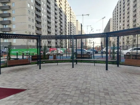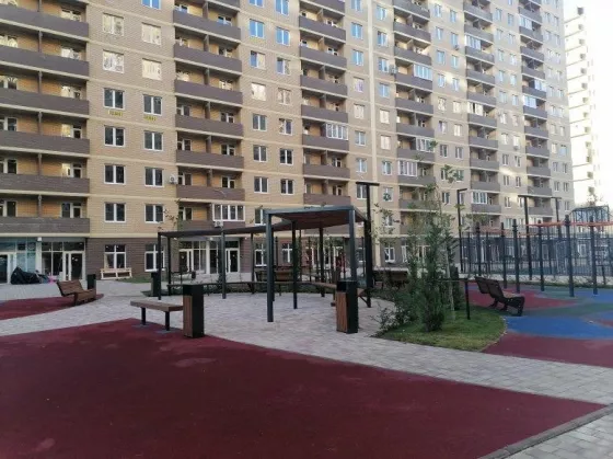 На первой линии ЖК высажен молодой яблоневый сад, красивая аллея с зонами отдыха. Много парковочных мест, двор вымощен плиткой, красочные безопасные детские площадки ограждены от проезжей части.