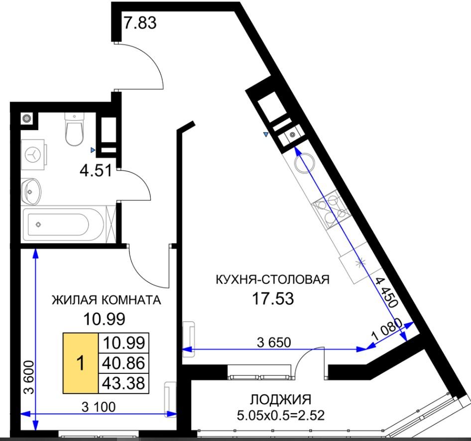 Продается однокомнатная новостройка, 43.36 кв.м., 10/18 эт
