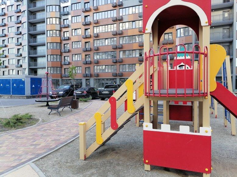 На стилобате безопасная детская площадка. Крытая парковка и гостевые парковочные места