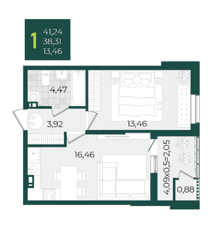 Продается однокомнатная новостройка, 41.24 кв.м., 11/21 эт