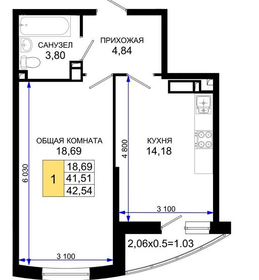 Продается однокомнатная новостройка, 44.6 кв.м., 10/19 эт