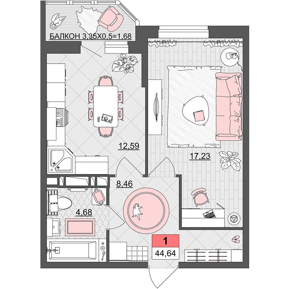Продается однокомнатная новостройка, 44.64 кв.м., 16/19 эт