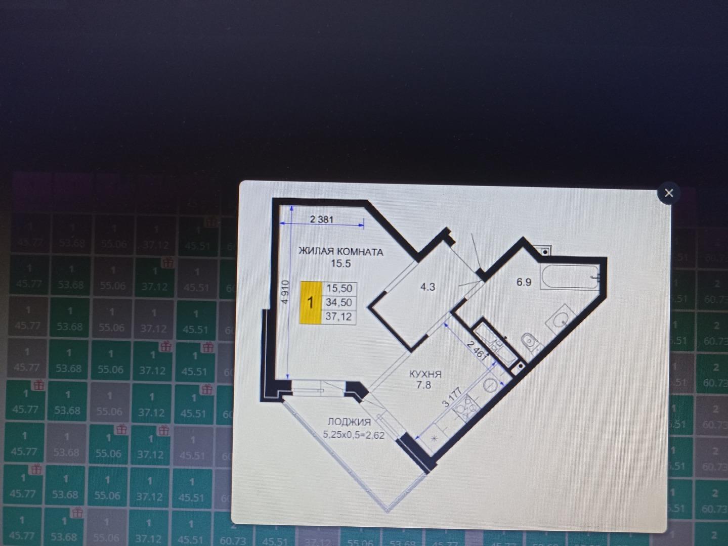 Продается однокомнатная новостройка, 37.12 кв.м., 8/12 эт