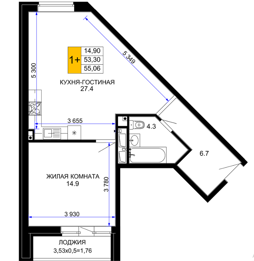 Продается однокомнатная новостройка, 55.06 кв.м., 5/12 эт