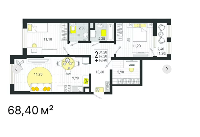Планировка с большой кухней-гостиной 21кв метр и с отдельным местом под кабинет или гардеробную!