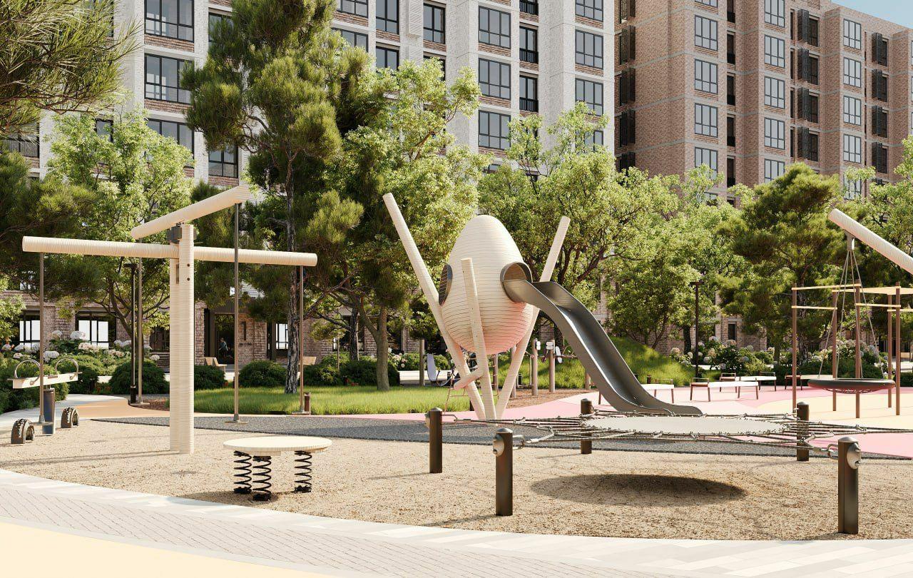 Во дворе фонтан, детские и спортивные площадки по возрастам, теннисный корт.