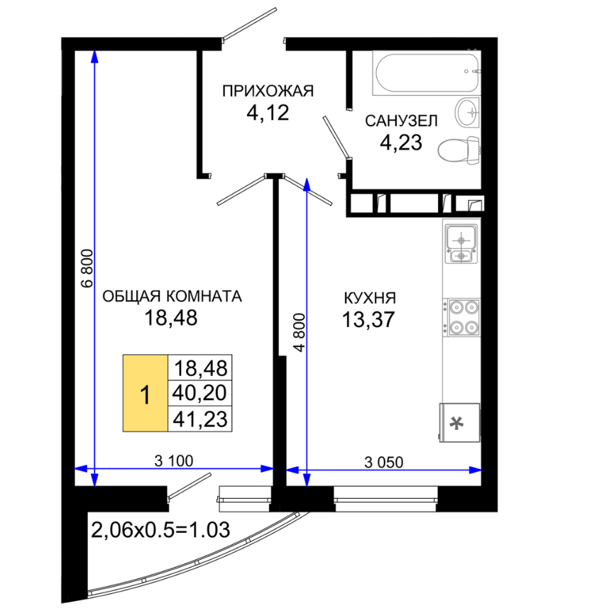 Продается однокомнатная новостройка, 41.2 кв.м., 16/19 эт