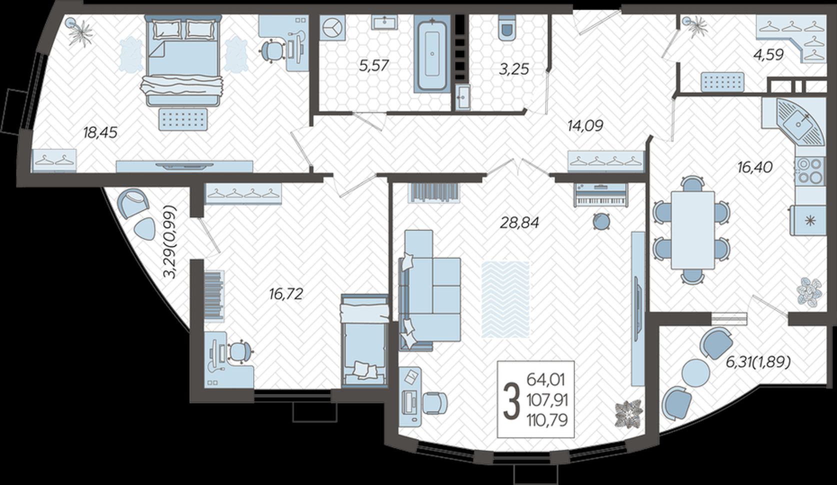 Планировка для большой семьи с очень просторными комнатами, гардеробной и кухней-гостинной!