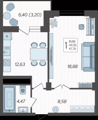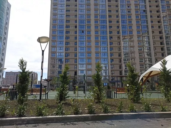 Квартира в шикарном жилом комплексе бизнес-класса, планировка с большой комнатой и просторной лоджией.