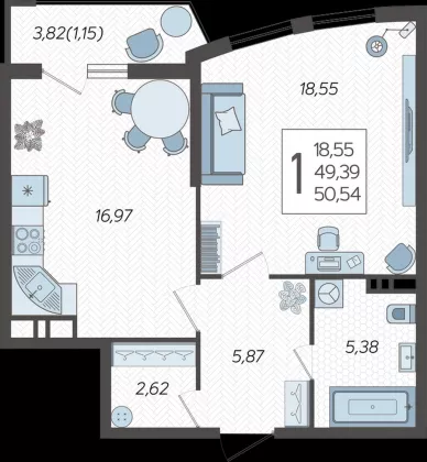 Планировка с большой комнатой, кухней гостинной и большим санузлом!
