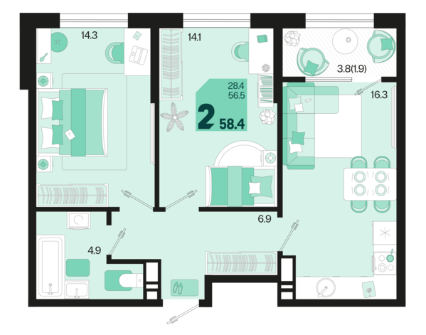 Продается 2-х комн. новостройка, 58.4 кв.м., 12/18 эт