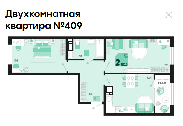 Продается 2-х комн. новостройка, 62.3 кв.м., 9/18 эт