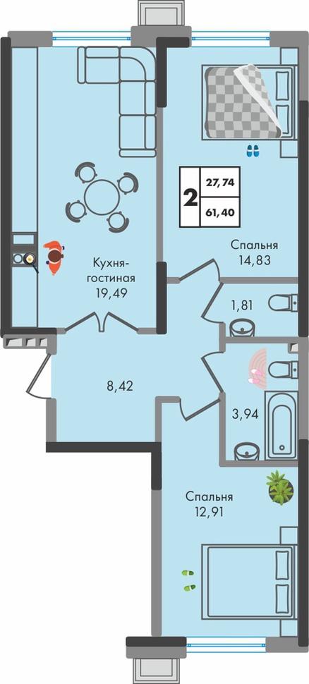 Продается 2-х комн. новостройка, 62 кв.м., 6/9 эт