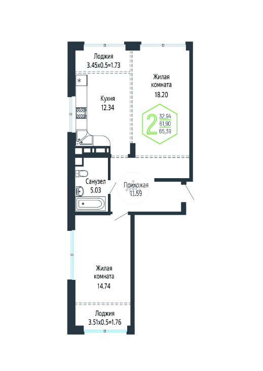 Продается 2-х комн. новостройка, 65.39 кв.м., 3/24 эт