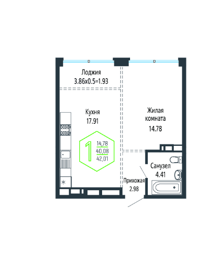 Продается однокомнатная новостройка, 42.1 кв.м., 11/24 эт