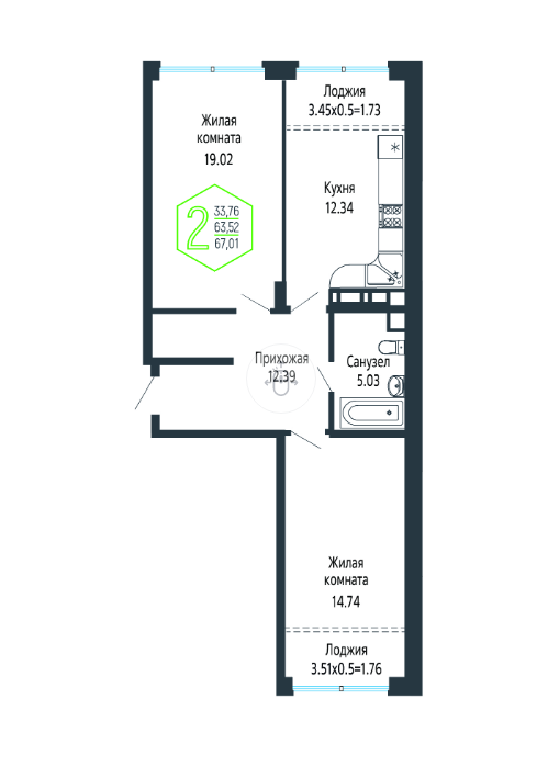 Продается 2-х комн. новостройка, 67.01 кв.м., 5/24 эт
