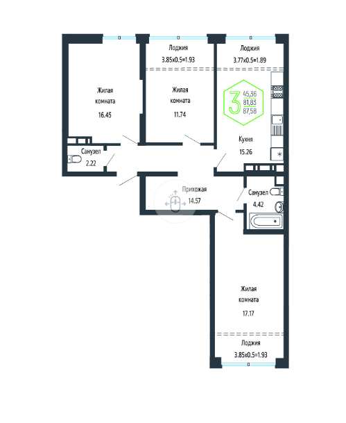 Продается 3-х комн. новостройка, 87.41 кв.м., 9/24 эт