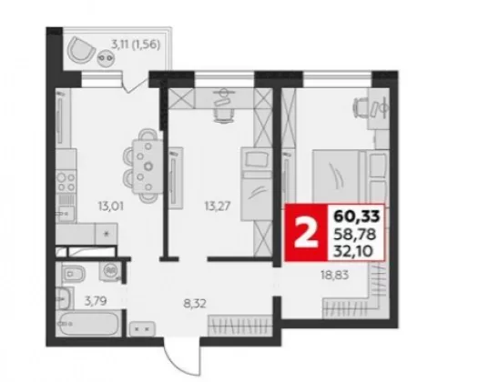Продается 2-х комн. новостройка, 60.33 кв.м., 7/8 эт