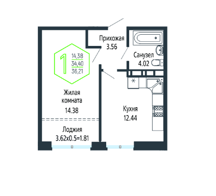 Продается однокомнатная новостройка, 36.21 кв.м., 5/24 эт