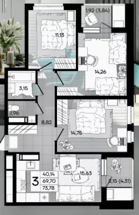 Трехкомнатная квартира в современном комплексе класса комфорт+.