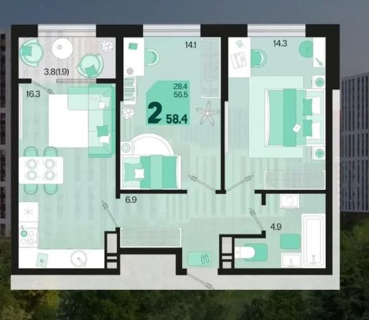 Продается 2-х комн. новостройка, 58.4 кв.м., 8/19 эт