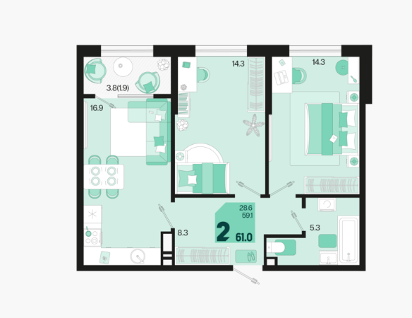 | Площадь, кв.м. | 61 |