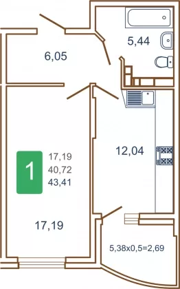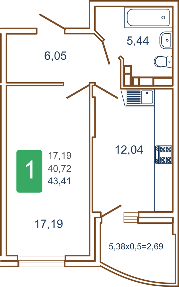 Продается однокомнатная новостройка, 43.41 кв.м., 8/16 эт