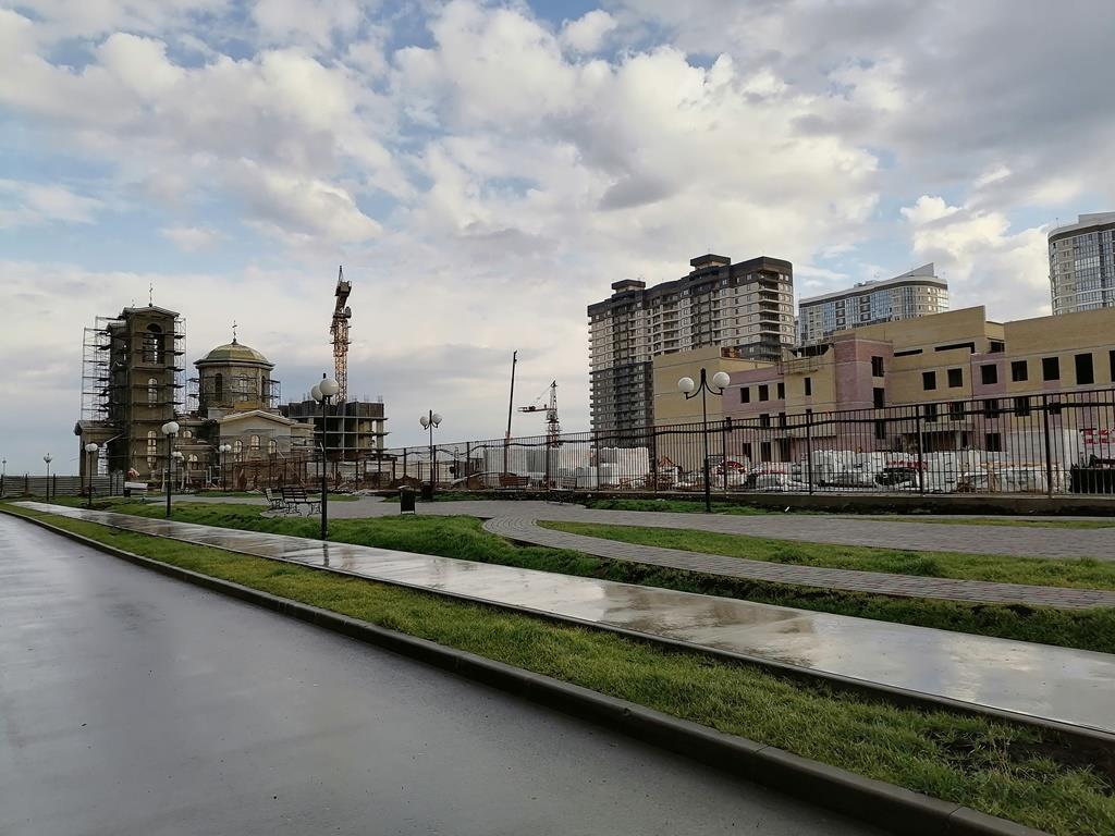 Большая зеленная аллея, фонтан, храм, велодорожки для автомобилистов.