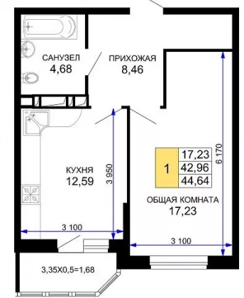 Продается однокомнатная новостройка, 44.65 кв.м., 15/19 эт