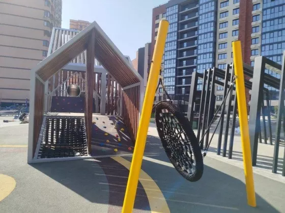Коммерческие блоки занимают нулевые этажи.  На территории двора расположено семиэтажное здание под офисы и торговые площади.