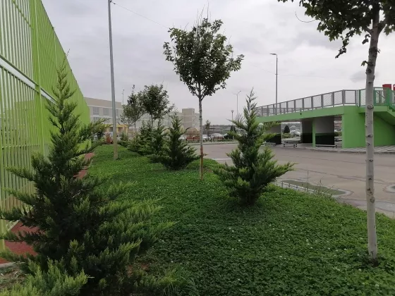 Большое расстояние между домами, много места для парковки автомобилей, также есть многоуровневая стоянка. Двор с красочными детскими и спортивными площадками, скамейками для отдыха и зелеными кустарниками и деревьями.