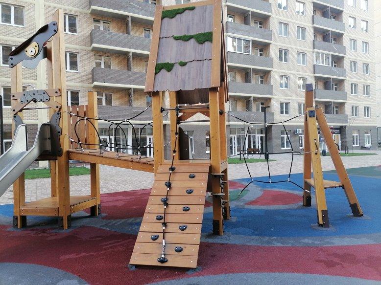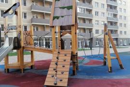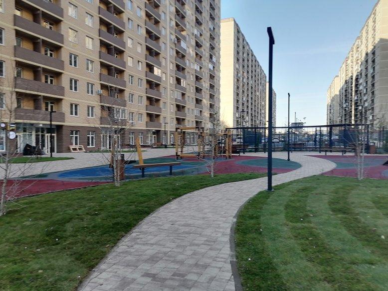 На первой линии ЖК высажен молодой яблоневый сад, красивая аллея с зонами отдыха. Много парковочных мест, двор вымощен плиткой, красочные безопасные детские площадки ограждены от проезжей части.