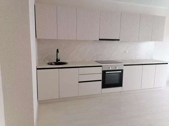 На кухне установлен кухонный гарнитур со всей необходимой техникой: варочная поверхность, духовой шкаф, вытяжка всё новое и добротное. Хороший смеситель и стильная раковина, на мебели дорогая фурнитура. Сан/узел - с сантехникой, балкон остеклен.