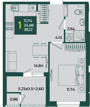 Продается однокомнатная новостройка, 38.12 кв.м., 12/18 эт