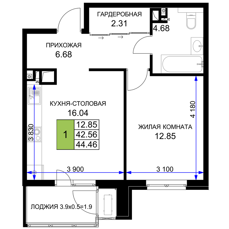 Продается однокомнатная новостройка, 44.46 кв.м., 11/16 эт