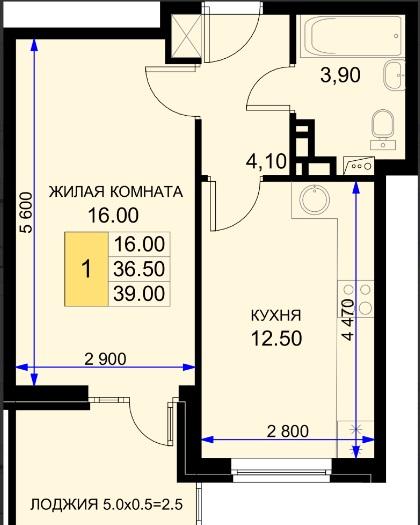 Продается однокомнатная новостройка, 39.1 кв.м., 3/7 эт
