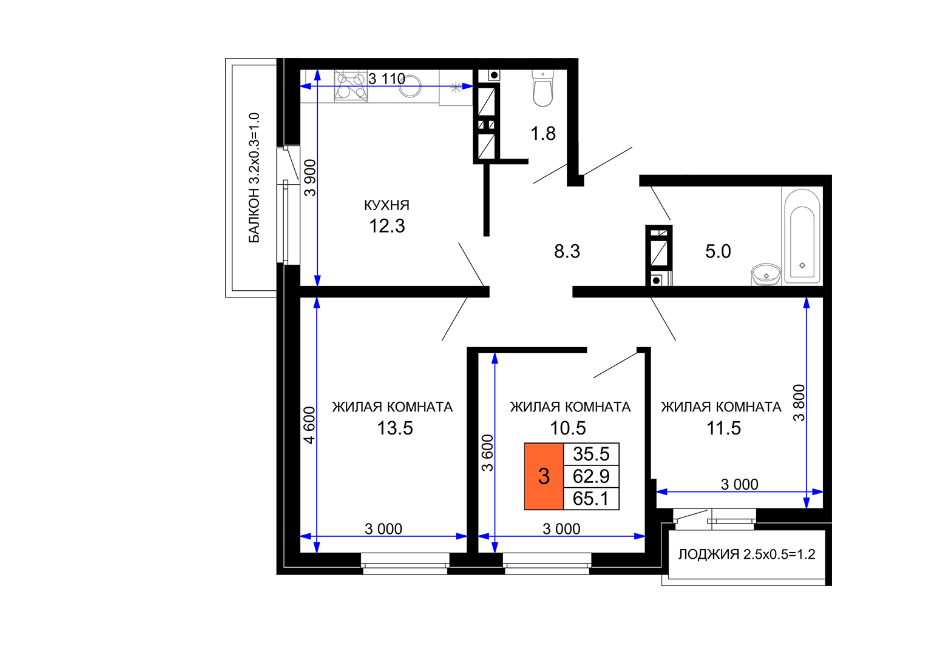Продается 3-х комн. новостройка, 67 кв.м., 7/16 эт