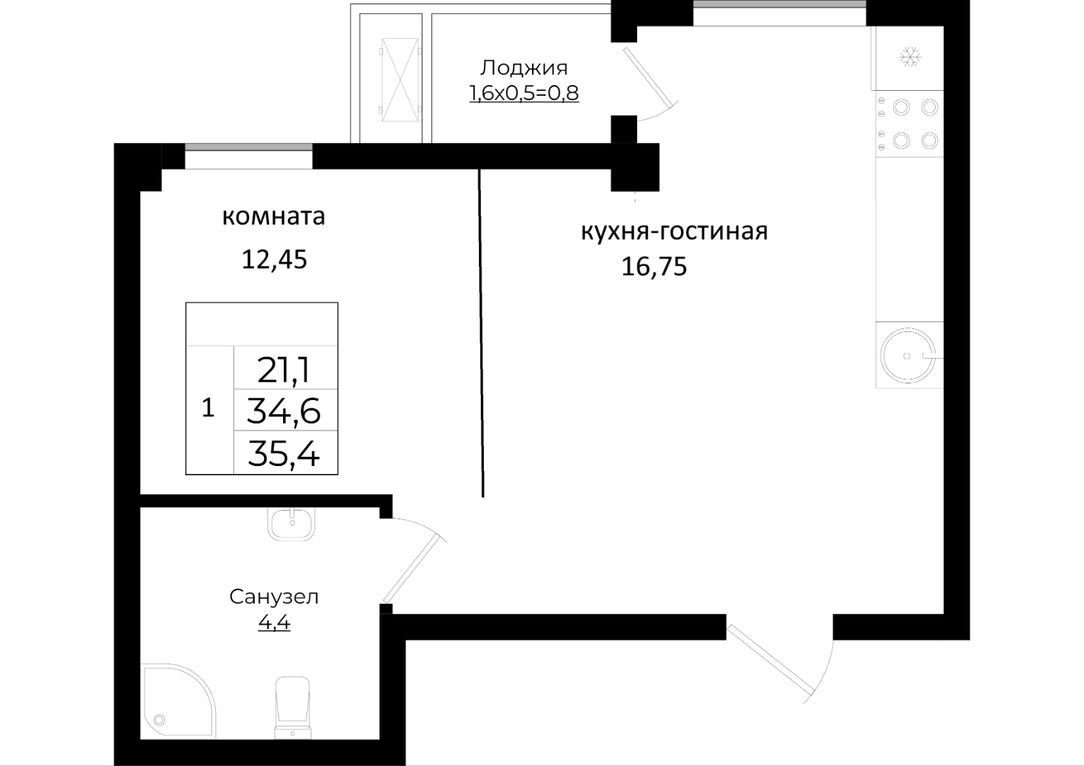 Продается однокомнатная новостройка, 35 кв.м., 4/9 эт