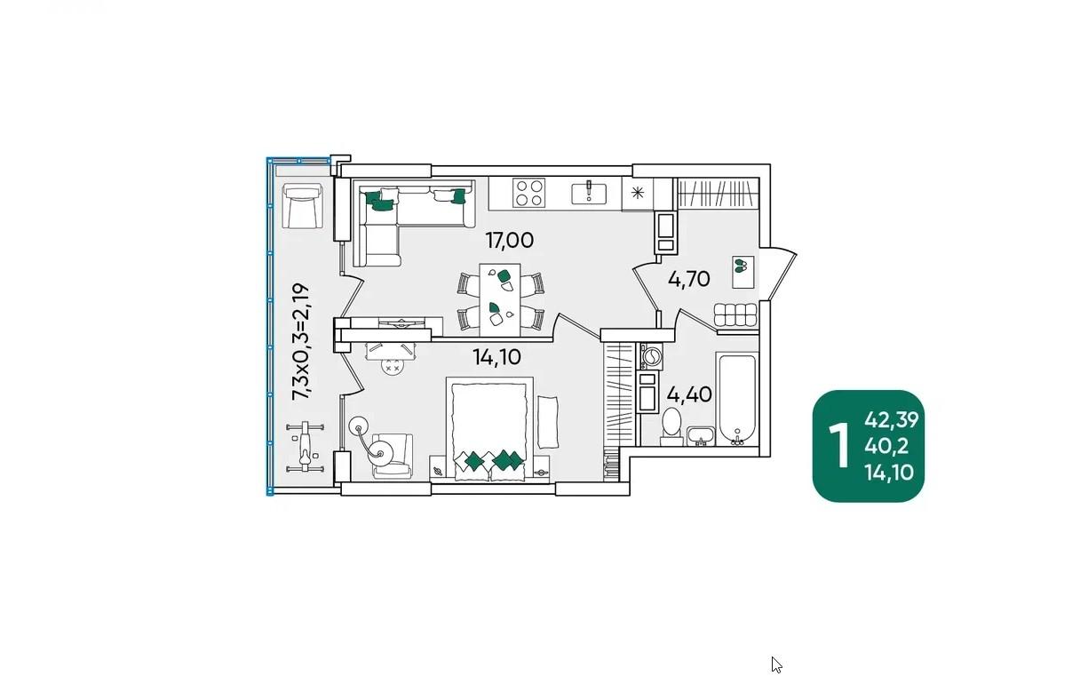 Продается однокомнатная новостройка, 42 кв.м., 8/21 эт
