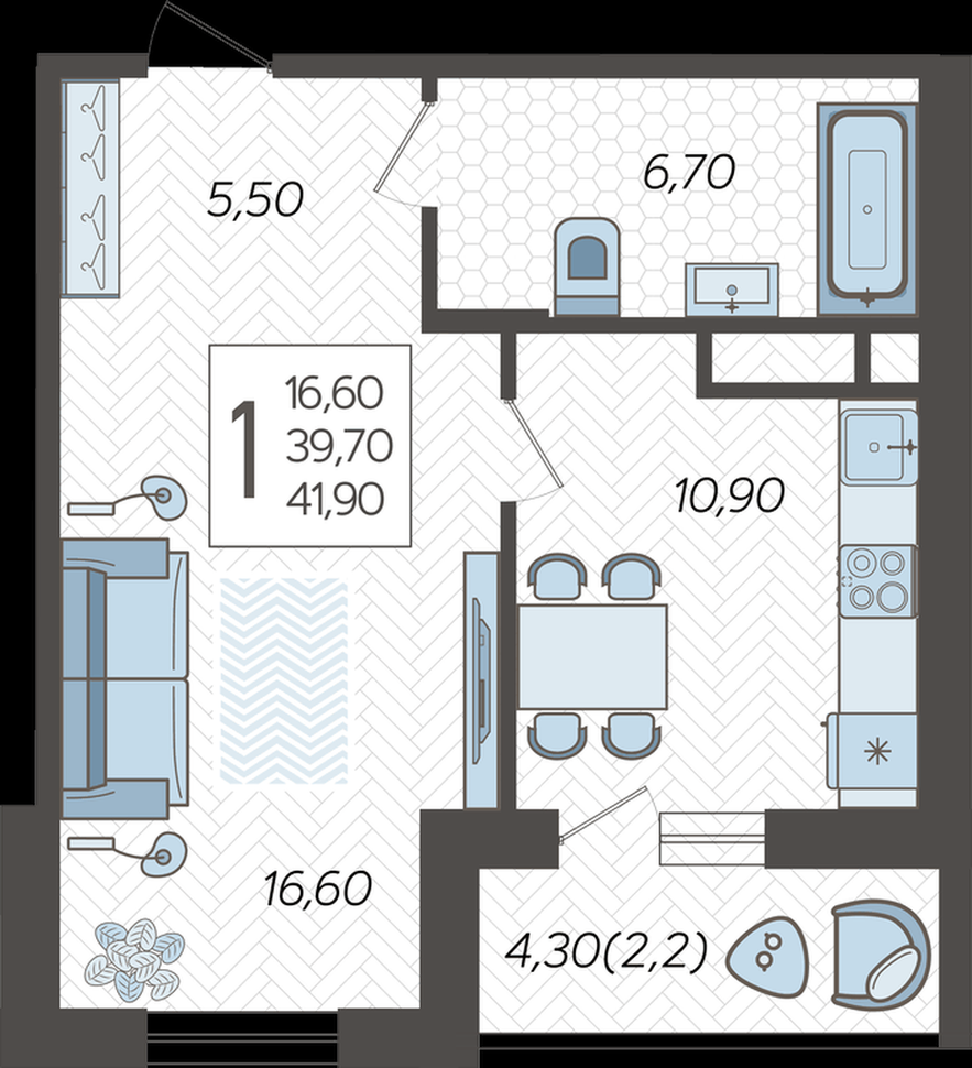 Продается однокомнатная новостройка, 41 кв.м., 7/16 эт