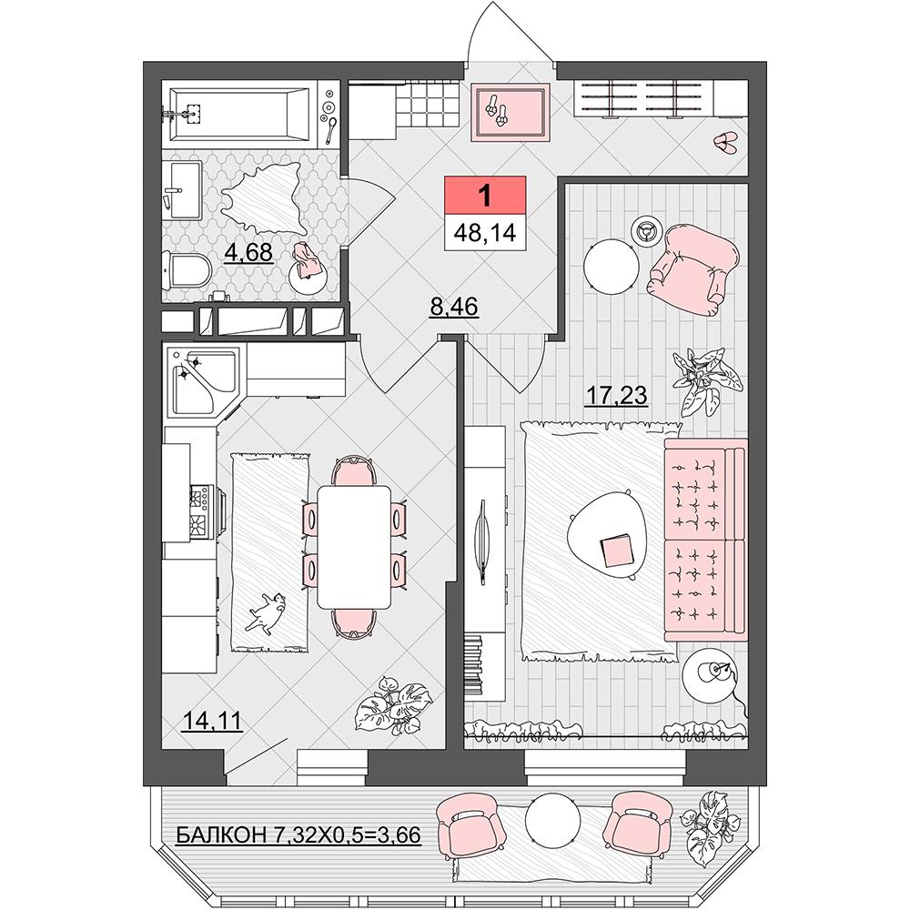 Продается однокомнатная новостройка, 41 кв.м., 7/16 эт