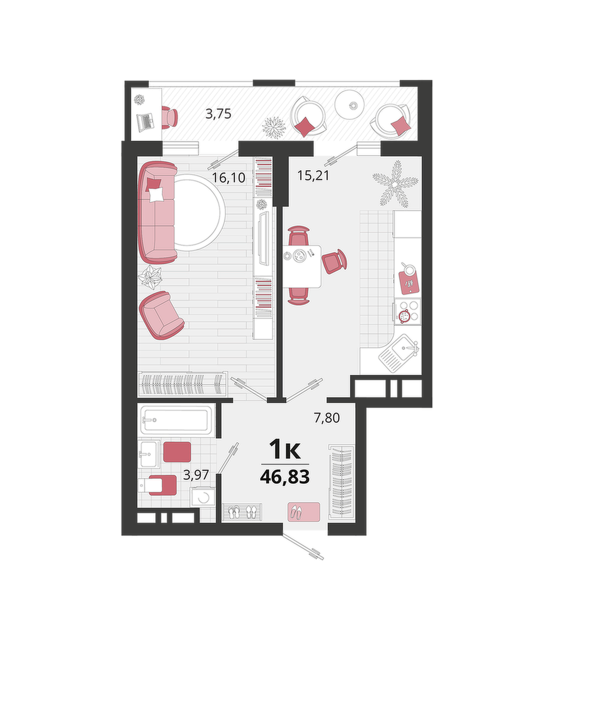 Продается однокомнатная новостройка, 44 кв.м., 6/16 эт